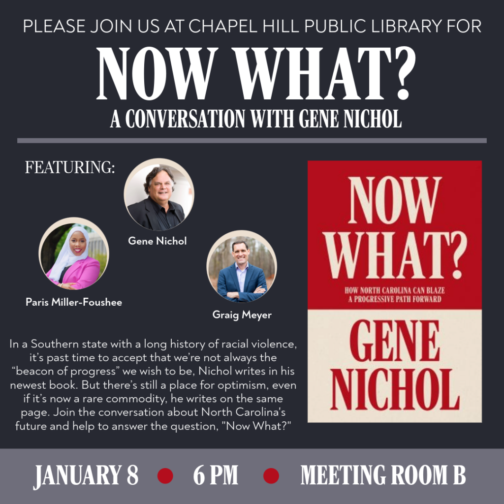 The first will be at the Chapel Hill Public Library on Wednesday, November 1, from 6:00 – 7:30 pm with Lloyd Kramer, Director of Carolina Public Humanities; the second will be at the Orange County Library in Hillsborough on Sunday, November 12 from 3 – 4:30 pm with Orange County Commissioner Sally Greene.